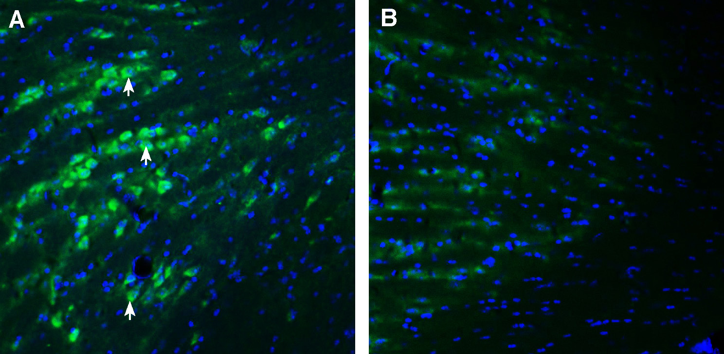 Figure 2. Expression of PACC1 in mouse reticular thalamic nucleus.Immunohistochemical staining of perfusion-fixed frozen mouse brain sections with Anti-PACC1/TMEM206 (extracellular) Antibody (#ACL-031), (1:200), followed by goat anti-rabbit AlexaFluor-488. A. PACC1 immunoreactivity (green) appears in neurons (arrows). B. Pre-incubation of the antibody with PACC1/TMEM206 (extracellular) Blocking Peptide (BLP-CL031), suppressed staining. Cell nuclei are stained with DAPI (blue).