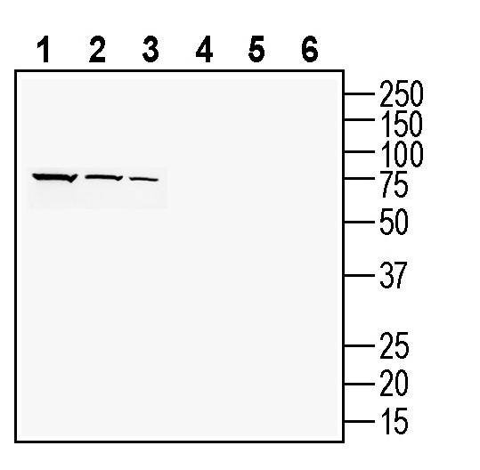 Figure 1: Western blot analysis of rat brain lysate (lanes 1 and 4), mouse brain membranes (lanes 2 and 5), and rat kidney lysates (lanes 3 and 6): 1–3. Anti-PACC1/TMEM206 (extracellular) Antibody (#ACL-031), (1:200).  4–6. Anti-PACC1/TMEM206 (extracellular) Antibody, preincubated with PACC1/TMEM206 (extracellular) Blocking Peptide (BLP-CL031).