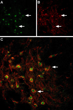 Figure 19. Multiplex staining of VMAT2using AMT-006-AG (green) and TRPC3 in rat brain.