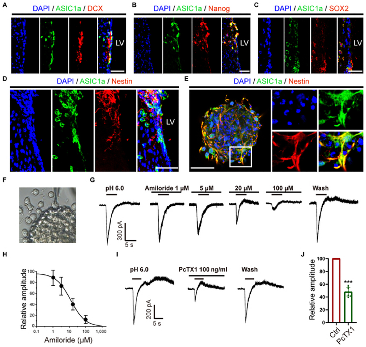 Figure 1. ASIC1a is expressed in NPCs. (A to D) Immunostaining images illustrating colocalization of ASIC1a [via Anti-ASIC1 Antibody (#ASC-014)] and DCX (A), Nanog (B), SOX2 (C), and Nestin (D) in SVZ. Scale bars, 20 μm. (E) Immunostaining images depicting colabeling of ASIC1a and Nestin in the cultured neurospheres. The square insets demonstrate the filopodia formation at the edge of cytoskeleton in each group. Scale bar, 50 μm. (F and G) The representative picture (F) and traces (G) showing pH 6.0-induced ASIC currents and the inhibitory effect of amiloride on the ASIC currents on a migrating NPC out from the neurosphere using the whole-cell patch clamp. (H) The curve showed that amiloride dose-dependently inhibited the ASIC-like currents in NPCs with a half-maximal inhibitory concentration of 11.98 μM. (I and J) Typical traces of pH 6.0-induced currents (I) and the inhibitory effect of PcTX1 (J) on the ASIC currents. DAPI was used to counterstain the nuclei. ***P < 0.001. Figure and legend from Ge H, et al. Research (Wash D C). 2023;6:0105. Published 2023 Jun 1. doi:10.34133/research.0105.