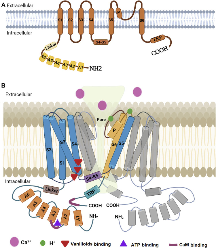 Figure 1. Structure of TRPV1. (A) One subunit showing the N-terminus containing six ankyrin subunits (A1-A6) and a linker, transmembrane region with six helical segments (S1-S6), a pore loop (P), and a C-terminus containing a TRP domain. (B) Two monomers of TRPV1 with a pore in the middle. One monomer (colored) is closer to the reader while the other (grey colored) is at 180°. The other two monomers have been omitted to show the pore.